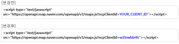 네이버 지도를 로드하기 위한 필수 코드로서 중간에 YOUR_CLIENT_ID 부분이 어플리케이션 등록후에 나오는 코드를 넣는 곳이다.