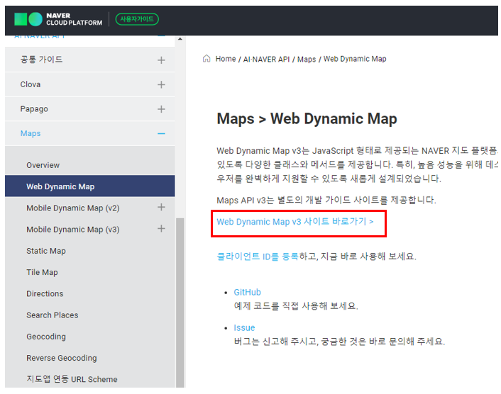 왼쪽 메뉴중 Web Dynamic Map 선택 / v3사이트 바로가기 클릭